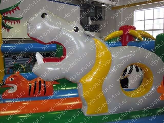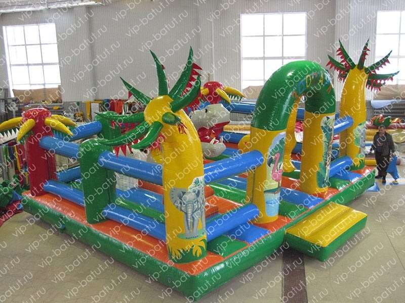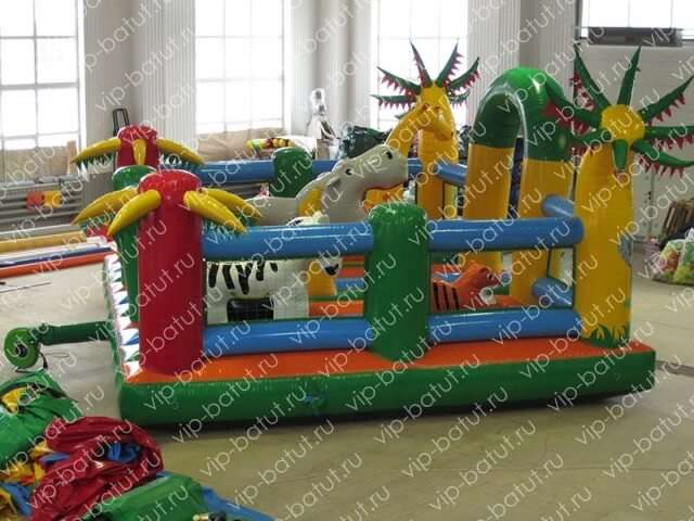 Оригинальный, яркий надувной батут «Зоосад», насыщенный игровыми элементами, парковый пневмоаттракцион. Здесь можно встретить большого бегемота, озорную сову, хитрую кобру, важного жирафа. Насыщенное игровое наполнение развлекательного центра, позволит маленьким посетителям вдоволь развлечься, развиться физически, эмоционально, конструктивно. С удовольствием ребятишки покатаются на жирафе, попрыгают с друзьями на ярком воздушном матрасе аттракциона, поиграют с другими фигурными элементами, ведь вместе интереснее резвиться, а тем более на таком красивом центре развлечений. Игровая зона детского батута великолепно просматривается со всех сторон благодаря ограждению в виде столбов, между которыми находится защитная сетка. Так у родителей нет оснований для беспокойства, они могут с любой стороны понаблюдать за всем происходящим на аттракционе. Вход на надувной батут сделан в виде арки, украшенной полноцветными красочными картинками, а по бокам расположены экзотические столбы-пальмы. Прекрасный развлекательный комплекс изготовлен из качественной пвх-ткани, прослужит Вам много сезонов, при надлежащем уходе за ним. К каждому заказчику у нас индивидуальный подход, что позволяет учесть все ваши пожелания и воплотить их в жизнь. Вас порадуют приемлемые цены на наши надувные батуты и высочайшее качество выпускаемой продукции. Обратившись к нам, Вы обязательно получите квалифицированную консультацию и сможете подобрать для развития своего прокатного бизнеса уникальный, красочный, современный надувной аттракцион.