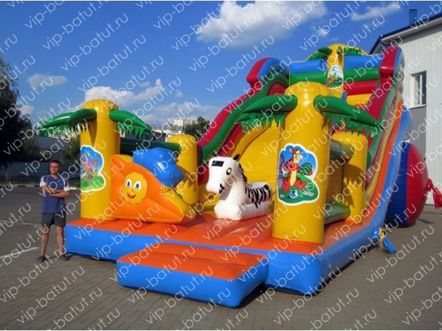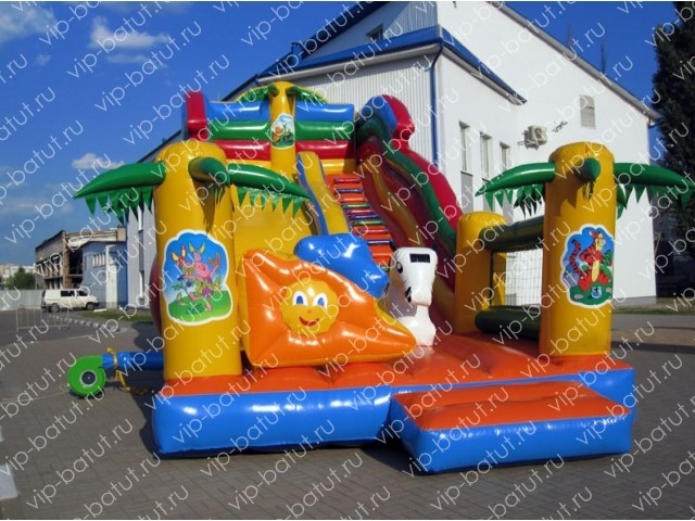 Наша творческая компания предлагает прекрасный, современный надувной аттракцион для активного отдыха детей на свежем воздухе. Надувная горка гарантированно понравится малышам, подарит море ярких эмоций, принесет неоценимую пользу физическому развитию детей. Насыщенная цветовая палитра пневмоаттракциона, удлиненная матрасная часть, скоростной спуск и игровые элементы, ребята оценят по достоинству. Маленькие, активные детишки с огромным удовольствием будут рассматривать красочные аппликации. Здесь ребята не заскучают, на горке для детей они смогут не только покататься, но и пофантазировать, попрыгать и порезвиться всей командой. Пальмы украшают вход развлекательной площадки, на которой расположена красочная полноцветная аппликация. Горка-батут хорошо разместится в парке, сквере, игровой площадке, открытой территории кафе и ресторане, набережной, пляже, торгово-развлекательном центре. Аттракцион прекрасно будет смотреться если рядом расположен наувной батут, вместе они представят новый батутный комплекс, а если добавить сюда ещё батут-робот, то можно получить многофункциональный развлекательный комплекс, который позволит увеличить пропускную способность площадки. Купить горку надувную в нашей компании, означает увлечь малышей полезной спортивной игрой, а свой бизнес обеспечить стабильной прибылью. Наши надувные детские горки, пневмороботы, батутные комплексы, батуты для детей производятся из высококачественного материала зарубежных производителей. Благодаря чему увеличивается срок эксплуатации наших парковых аттракционов при надлежащем уходе за ними.
