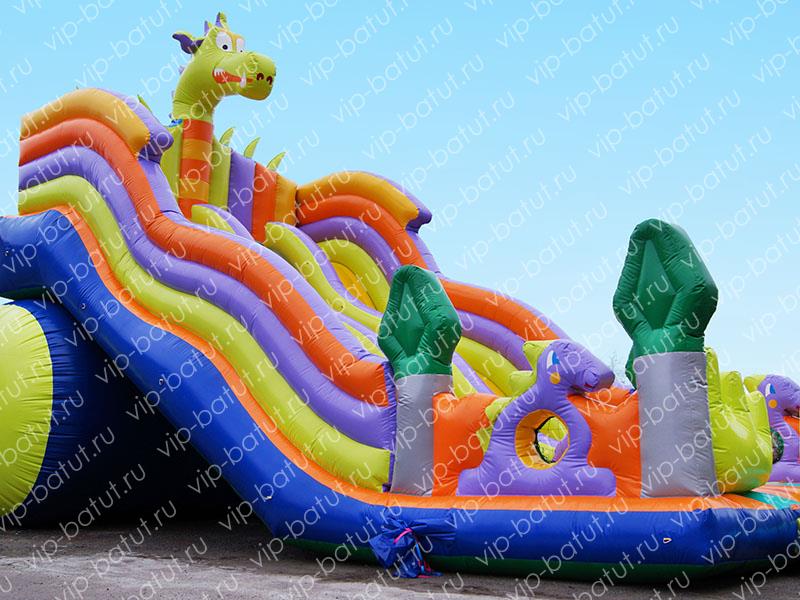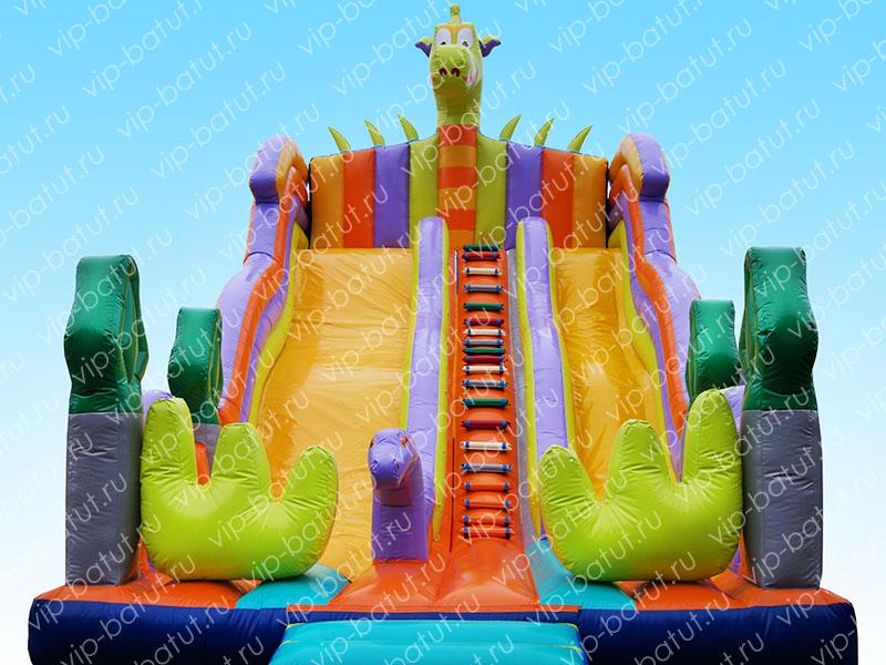 Надувная горка со стартовой высотой 5 метров включает в себя целых два полноценных каскадных спуска различной ширины. Между спусками находится ряд удобных мягких ступеней, отделенных от полотен горки невысокими прочными надувными бортами. Внизу каждого спуска установлены надежные стопоры,приятного салатового цвета, в форме лапок дракона, удобно «устроившегося» на вершине аттракциона.
