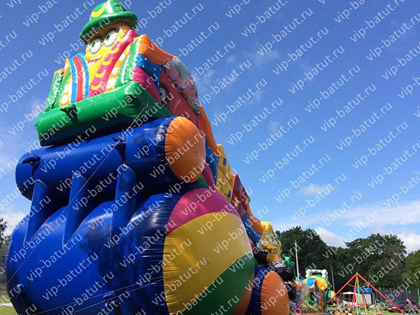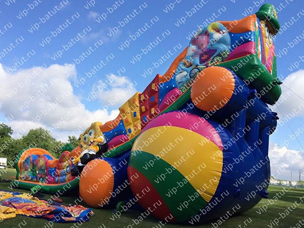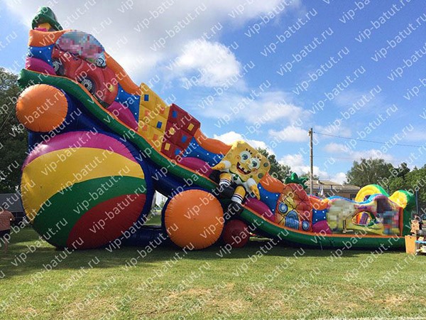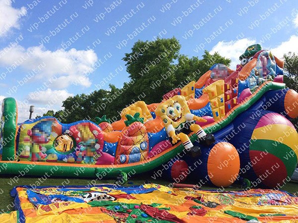 • Высокие надувные борта аттракциона заслуживают отдельного обзора: с обеих сторон на них, спиной к резвящимся ребятам, удобно устроились две надувные фигуры, всем знакомого мультипликационного персонажа в желтых квадратных штанах – они приглашают всех желающих посетить аттракцион.