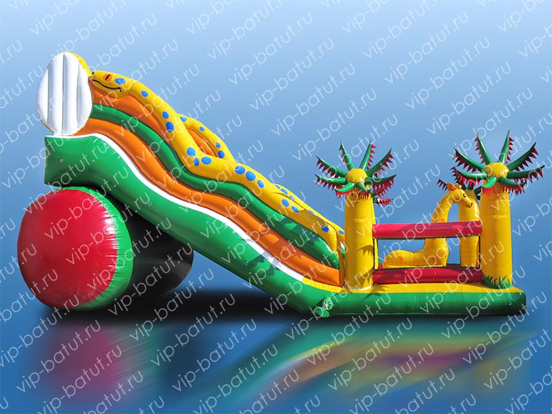 • Надувная горка с 5-метровой стартовой высотой и каскадным спуском выглядит очень занимательно: ярко-желтый спуск выгодно контрастирует с белоснежной поверхностью подъема, на которой разноцветными пятнами выделяются мягкие удобные ступени. Необычны и борта аттракциона – вдоль всей их длины вальяжно «растянулись» два длиннющих питона.