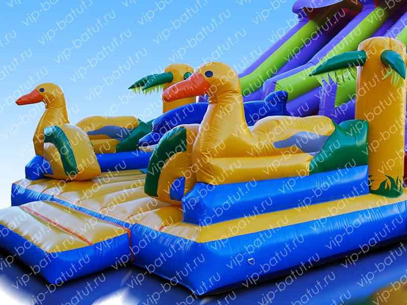 Боковые столбцы аттракциона выполнены в виде желтых пальм с зелеными листьями, по углам установлены интересные надувные игрушки в виде морских птиц – они одновременно несут защитную и декоративную функции.