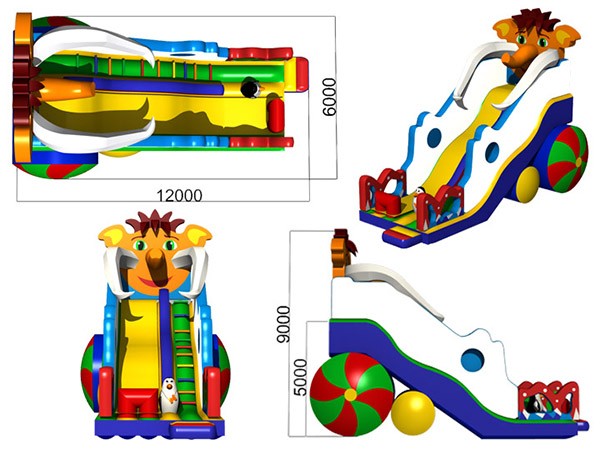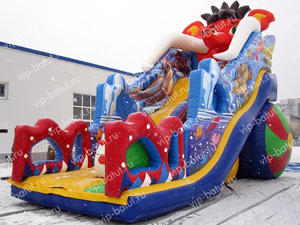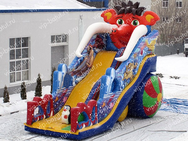 Новая надувная горка от российской компании-производителя, сразу привлекает внимание. Огромная голова добродушного мамонта на ее вершине, длиннющие белоснежные бивни которого, лежат вдоль бортов аттракциона, а милый хобот так забавно торчит вперед, словно бы приглашая ребятишек поскорее начать игру.