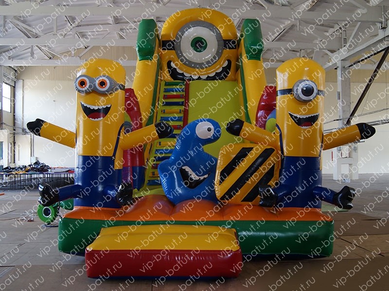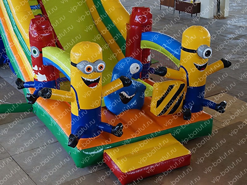 На горке-батуте очень весело кататься, прыгать на батутной части и играть. К тому же таким образом у малышей массируются десятки биологически активных точек, которые влияют на работу всех органов, укрепляются мышцы спины. Надувная горка очень понравится ребятишкам, им будет интересно, весело, увлекательно. Они с большим удовольствием прокатятся с горочки, пролезут через кассету на четвереньках и снова порезвятся с друзьями на красочно оформленном батуте. Между оградительных столбов и аркой расположена цветная сетка, которая дает возможность родителям контролировать игры малышей на аттракционе. На входе горки ребят встречают два озорных миньона. Игры на батуте-горке — это увлекательно, весело, приятно, доставит массу положительных эмоций. Такая детская горка будет вне конкуренции, она затмит своей красочностью все надувные конструкции находящиеся вокруг. Купить надувную горку от производителя — обеспечить себе успешный прокатный бизнес. А детворе физическое развитие, прекрасное настроение. Наши надувные аттракционы отличаются высоким качеством, быстрой окупаемостью, оригинальностью, уникальностью, надежностью, практичностью, легкостью в эксплуатации. Среди нашего ассортимента большие горки, батуты, пневмороботы, батутные комплексы на любой вкус.