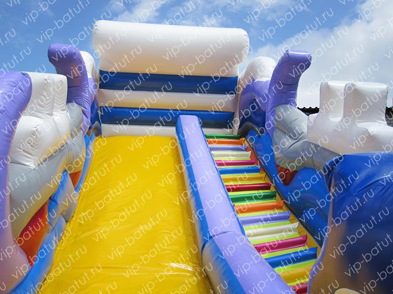 Высокие борта горки надувной украшены четырьмя огромными пароходами, между ними – фиолетовые щупальца осьминога. Кажется, что еще немного и он утащит весь караван судов в морскую пучину. Но не тут-то было – корабли продолжают свой путь, дельфин не боясь, указывает им верное направление, а звенящие волны пенятся и шумят. Задумка авторов аттракциона, создать у посетителей полное ощущение морского приключения, на наш взгляд удалась.