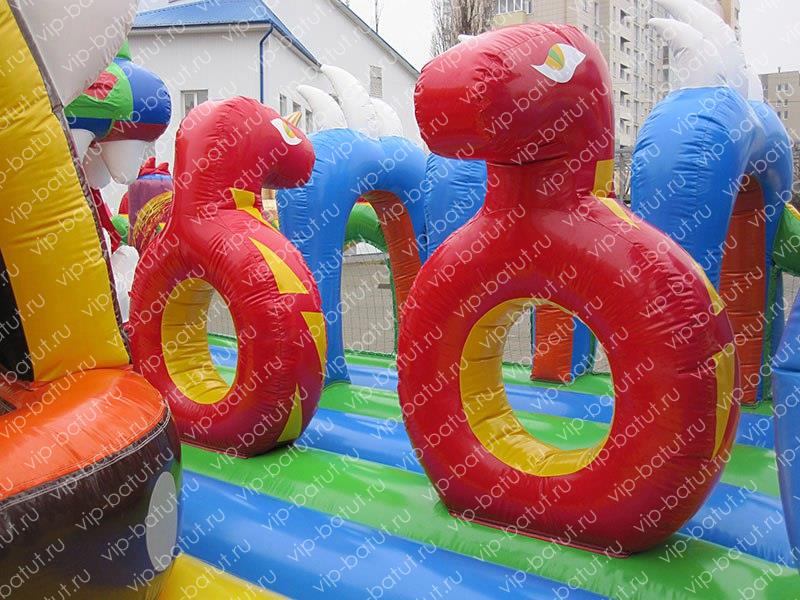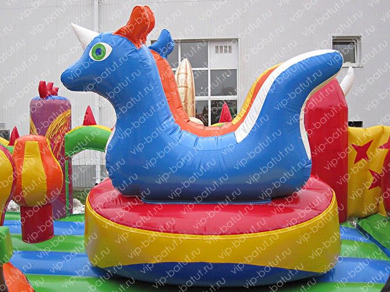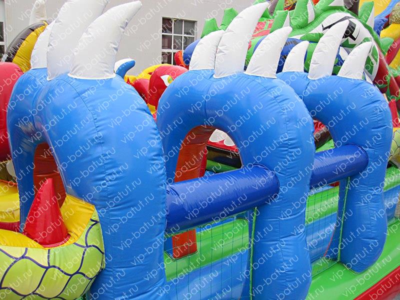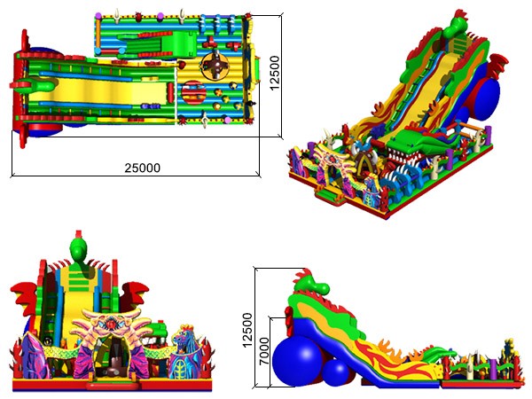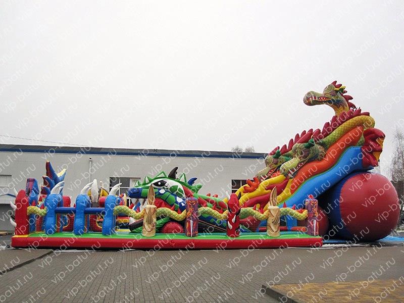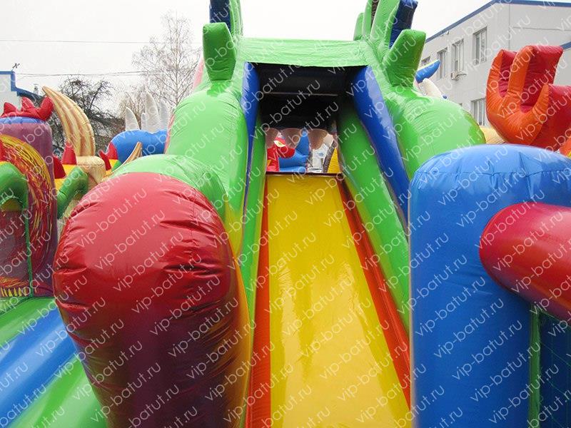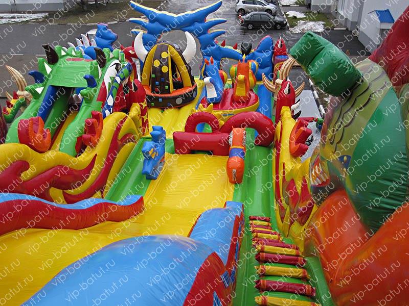 Огромнейший надувной игровой комплекс «Битва Драконов», со стартовой высотой горки 7 метров, не оставит ни одного ребенка в стороне. Он завлечет внимание своими красками, размерами, разнообразностью игровых элементов, всех в округе, разработан специально для вас, нашими ведущими конструкторами и дизайнерами. Яркие полноцветы, интересные и безопасные конструкции на надувном батуте, скалолазка, в виде шлема викингов, помост с уникальными животными, арки на батуте, быстрый, экстремальный и главное, безопасный съезд с 7 метровой надувной горки, красочный пневморобот — это все огромнейшая площадка для игры. Каждый ребенок захочет попасть в этот удивительный мир драконов. Вам стоит всего лишь купить коммерческий аттракцион и принести массу позитивных эмоций окружающим. Наш надувной комплекс для детей, украсит собой любое место, где бы его не разместили, в парке, на площади или в любом другом месте. Он все равно будет выделяться своими размерами и красками. Наш комплекс «Битва Драконов» составит конкуренцию всем аттракционам мира.