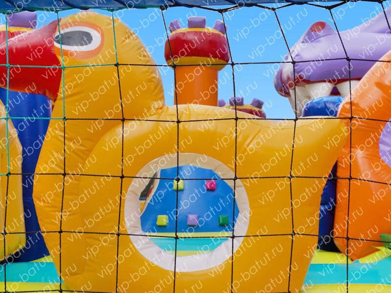 Надувной комплекс, забавно украшенный добрыми мордашками (и печатными, и надувными – гляньте на вершину горки!), сразу понравится всем ребятам, даже самым маленьким и еще не таким смелым. Дело в том, что наши художники поставили перед собой задачу сделать надувной комплекс для ребят всех возрастов и у них это отлично получилось.