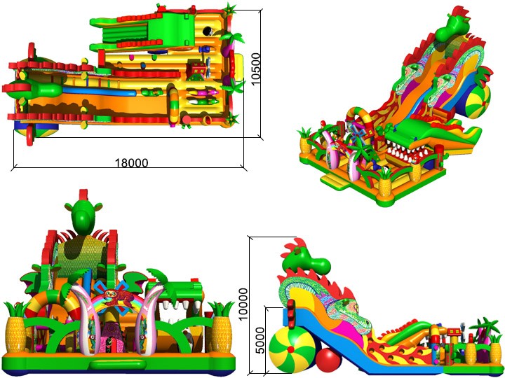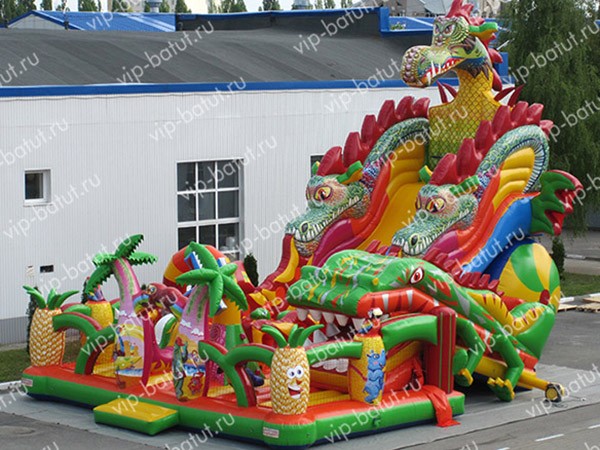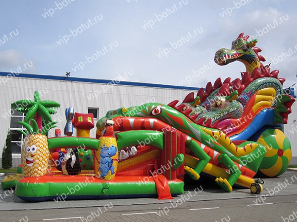 Надувной батутный комплекс, площадью 180 квадратных метров, украшен огромной фигурой трехголового змея: одна голова возвышается над горкой, две другие – удобно расположились вдоль ее бортов. Огненно-алые языки пламени, исходящие из пастей Горынычей, смотрятся ярко и необычно, а маленькие надувные крылышки, придают исполинской игрушке еще большего очарования. Но не только декоративными, но в первую очередь, игровыми элементами примечателен наш комплекс: