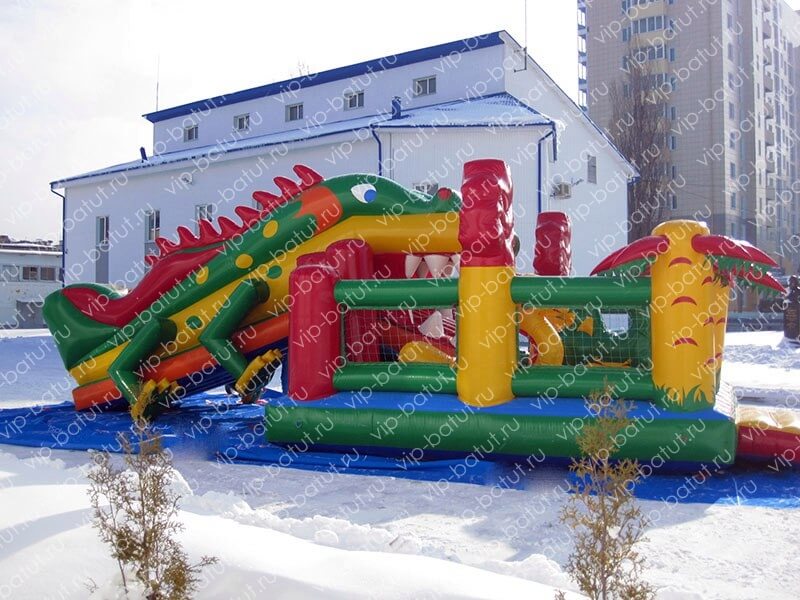 Надувной комплекс с роботом, можно поставить как на улице, так и в современный развлекательный центр, включает в себя тематический коммерческий большой батут-робот с автоматически поднимающимся лифтом-челюстью и батутную площадку с игровыми элементами. Яркий надувной комплекс для детей, огражден декоративными столбами, между ними находится сетка для безопасности малышей. В оформлении батутного аттракциона широко используется красочная аппликация. Детский надувной комплекс вместил на своем матрасе разнообразие игровых элементов, ребята будут играть с веселыми дракончиками, кататься с маленькой горочки, пролазить через кассеты, прыгать и резвиться на батуте. Каждый ребенок почувствует себя комфортно на площадке.