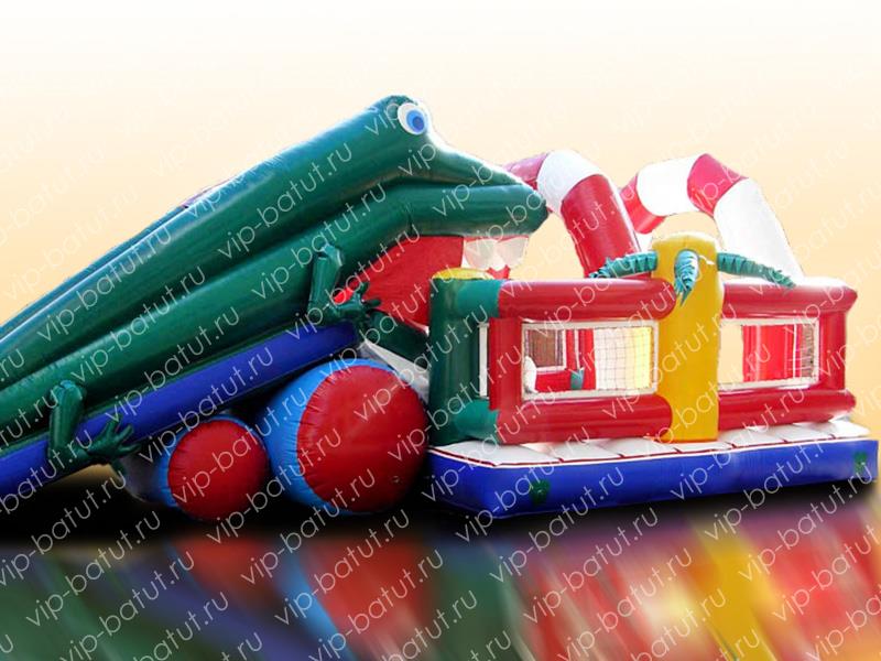 Два надувных аттракциона на одной площадке – отличное решение для прокатного бизнеса. Пока одни ребятишки катаются в пасти надувного робота (компрессор превращает нижнюю челюсть робота в своеобразный лифт, который поднимает детей на 2-метровую надувную горку), другие с удовольствием прыгают на надувном батуте. Робот, в виде огромного зеленого крокодила – самый яркий и заметный элемент аттракциона.