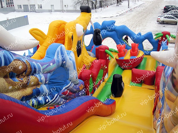 Огромный надувной комплекс свободно вмещает несколько десятков детей любого возраста. Для такого масштабного аттракциона рекомендуется привлекать к работе двух операторов, которые будут контролировать процесс игры и выполнять функции кассира.