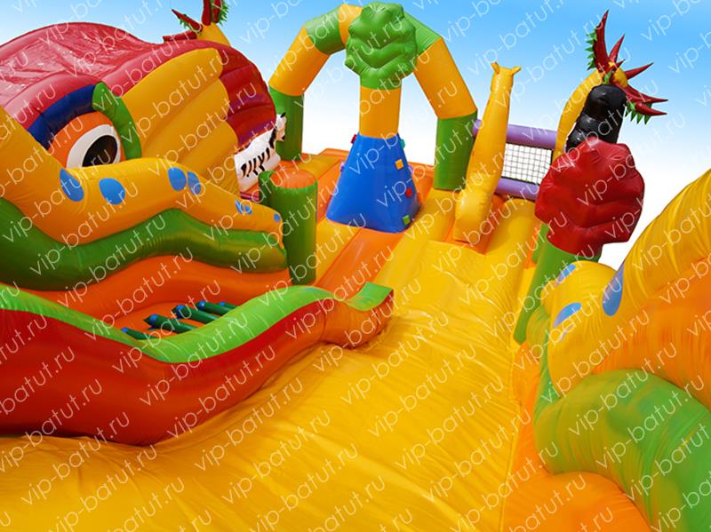 • 5-метровая надувная горка с каскадным спуском – самый заметный элемент комплекса. На ее вершину ведут зеленые мягконабивные ступени, высокие борта, на которых удобно устроились два желтых надувных питона, служат не только надежной защитой малышей, но и придают аттракциону дополнительную устойчивость. Задняя стенка горки украшена полноцветной печатью, с изображением героев из любимого мультфильма про этот чарующий остров.