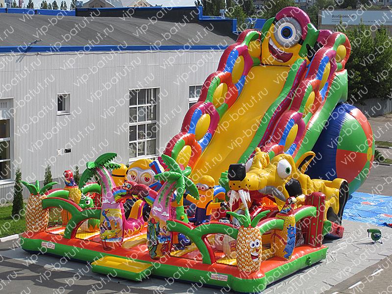 Все знают смешных героев мультфильма в синих комбинезонах и забавных очках. А когда эти карапузы сходят с экранов и начинают «жить» на батутном комплексе, становится ясно – радость и веселье гарантированы! А чтобы было еще веселее, мы добавили к их пестрой компании пневматического робота ,в виде огромной белки и несколько игровых элементов поменьше. Но давайте обо всем по порядку: