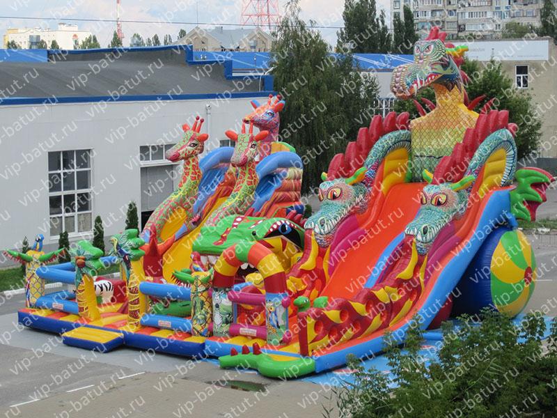 • Надувные горки имеют стартовые высоты 4 и 5 метров. Спуски – волновые. Украшают горки драконы и жирафы. На вершины ведут ряды разноцветных мягких ступеней, отделенных от полотен спусков невысокими надувными парапетами.