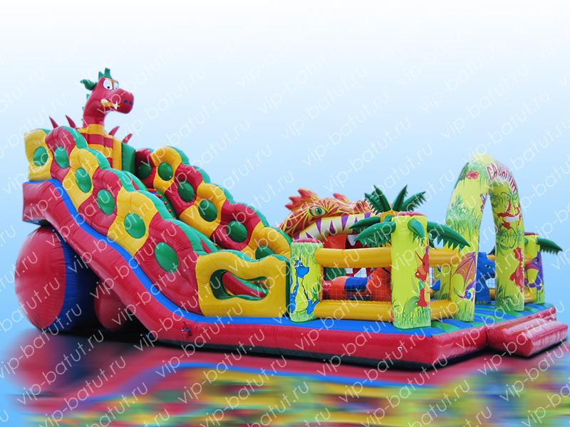 • Каскадная надувная горка высотой 5 метров видна издалека. Огромная голова дракона на прочной задней стенке аттракциона служит отличным украшением всего комплекса.