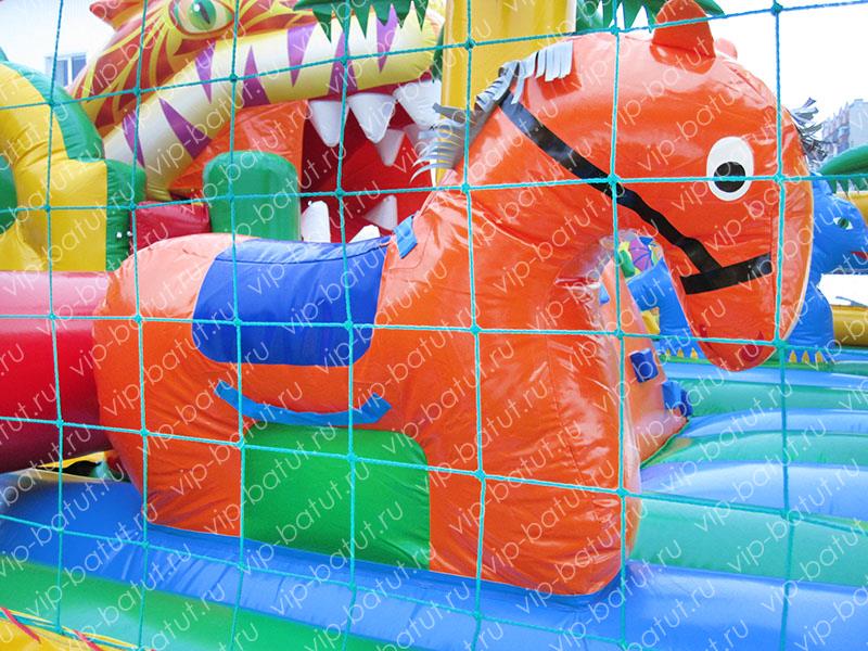 Высокий арочный вход, интересные боковые столбцы-пальмы, забавные разноцветные картинки с изображением дракончиков (здесь есть даже трехголовый!) придают особое очарование надувному аттракциону. Нейлоновые сети вдоль бортов, дают родителям замечательную возможность наблюдать за своими чадами, не вмешиваясь в веселый процесс игры.