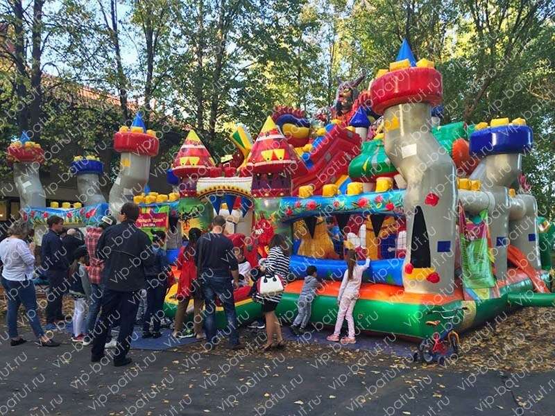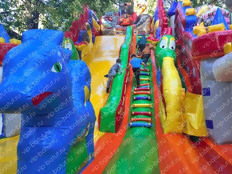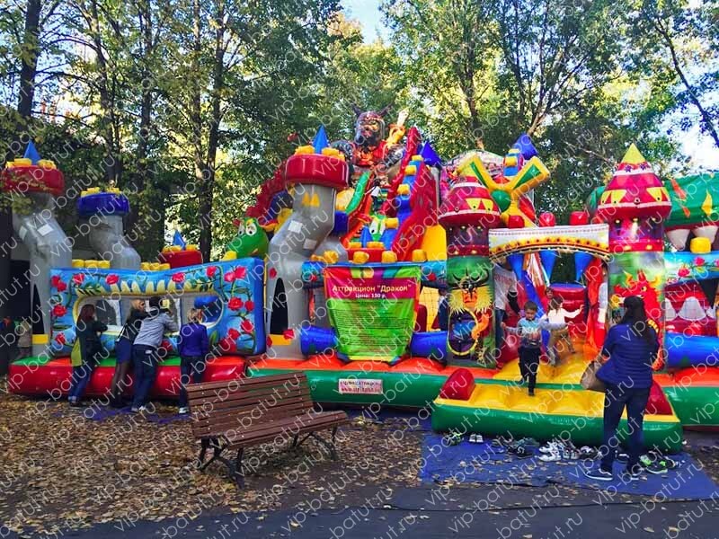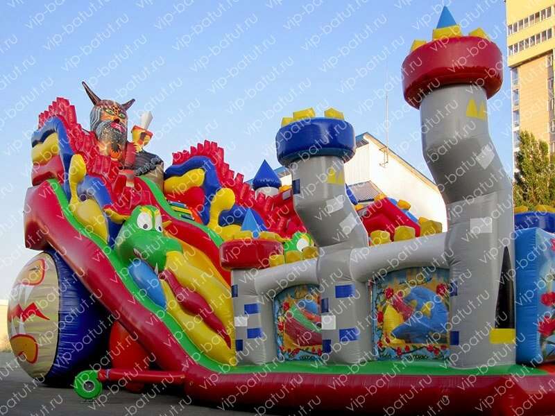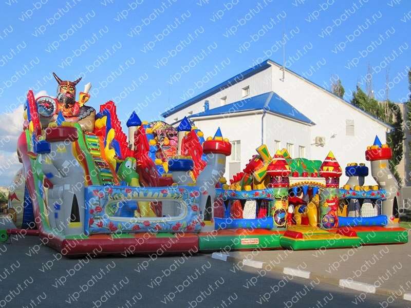 Большой многофункциональный батутный комплекс «Варяги» поразит своей масштабностью и ярким оформлением. Ребята перенесутся в удивительный мир варяг и огнедышащих драконов. Каждый из малышей найдет для себя развлечение, ведь наш батутный комплекс отличается множеством игровых зон. Две надувные горки со стартовой высотой 4 и 6 метров, идеальное решение для детей всех возрастов. На горках имеются удобные разноцветные ступеньки, по которым детишки весело и безопасно будут подниматься наверх. Множество красочных башенок, большой дракон- пневморобот, горки — идеальное времяпровождение для маленьких непосед. Надувные аттракционы нашего производства, отлично зарекомендовали себя на рынке. Мы как производители заботимся о качестве наших изделий, поэтому используем только высококачественные и безопасные материалы. Данный батутный комплекс идеально дополнит ваш парк аттракционов и принесет хорошую прибыль. Купить надувной батутный комплекс для детей от производителя — это верное решение для вашего успешного бизнеса.