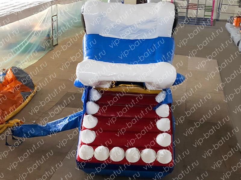 Нижняя челюсть пневматического робота квадратной формы, что значительно увеличивает ее вместительность – здесь без труда разместятся несколько ребятишек. После сигнала таймера, отдельный компрессор (всего их два в комплекте поставки готового аттракциона) начинает быстро нагнетать воздух, и пасть робота закрывается, превращаясь в настоящую надувную горку. Скатившись вниз, довольные малыши выскакивают с другой стороны и быстренько бегут за новой порцией веселых приключений.